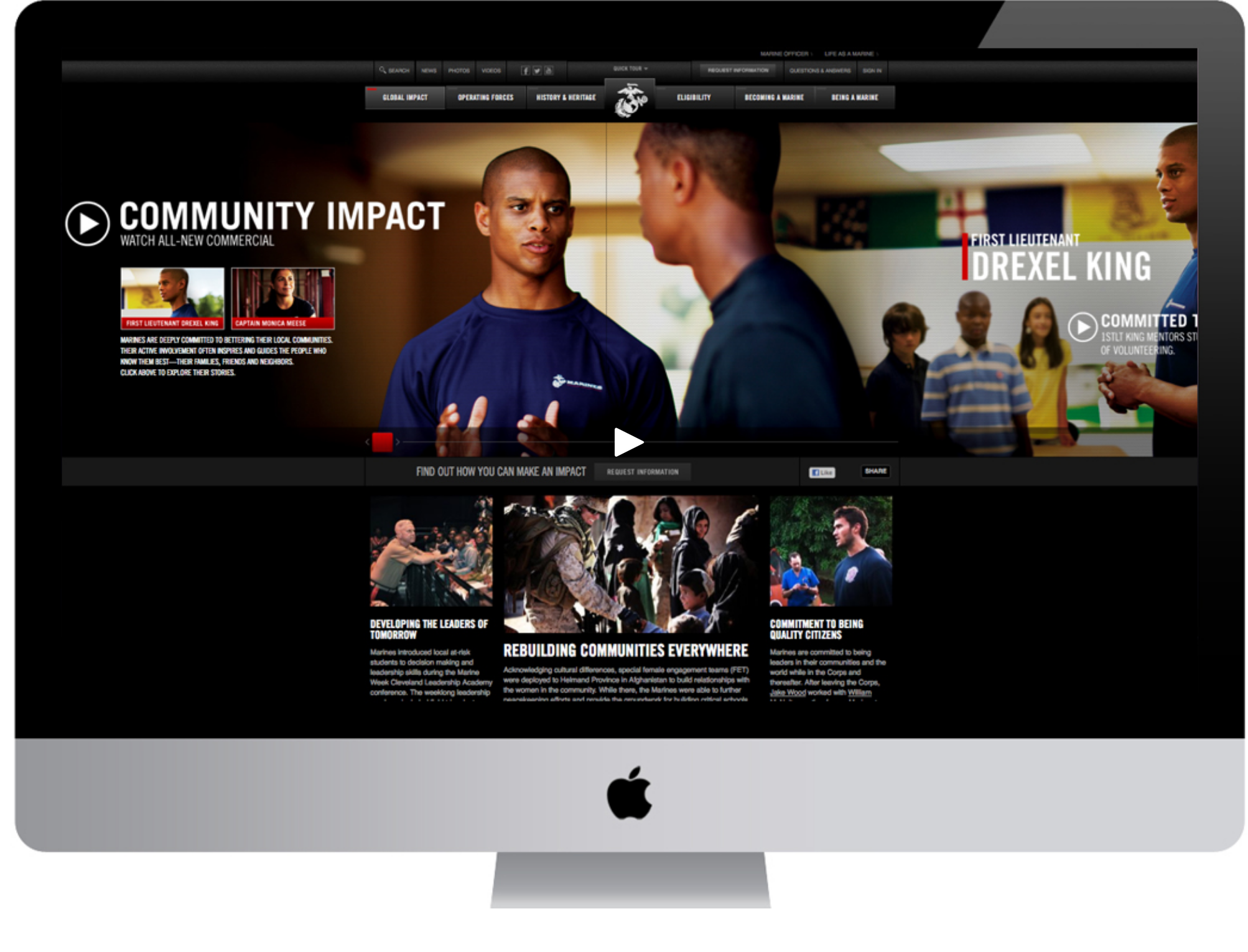 Idea: Fighting with a Purpose, was intended to reinforce the broader notion of service — helping others who are in need. It was developed based on the insight that for the diversity prospect audience in particular, the idea of service applies to helping those in need wherever they may be at home or abroad. The campaign consisting of television, print, digital and mobile to increase Marine Corps brand affinity and consideration of service.